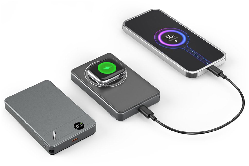 Cette batterie prend en charge la charge sans fil magnétique 15W pour téléphone, 3W pour écouteurs et 2.5W pour Apple Watch. Elle recharge trois appareils en même temps, éliminant le besoin de multiples câbles ou chargeurs.
