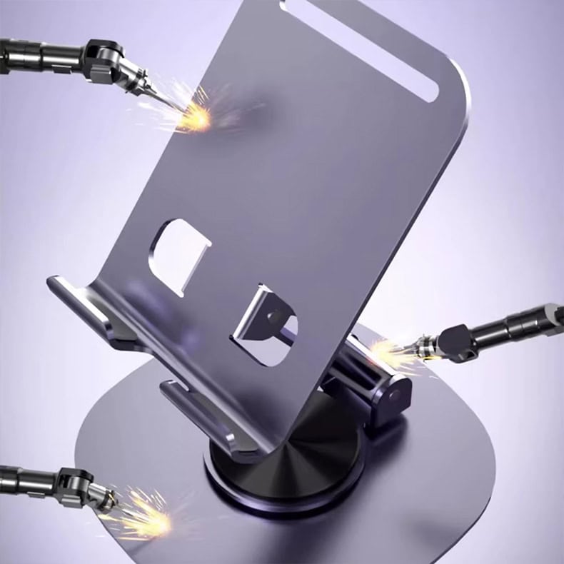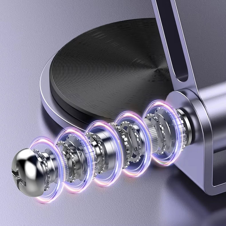 Alliant design moderne, stabilité et praticité, ce support de bureau en aluminium offre un maintien fiable pour les téléphones et les tablettes. Sa base rotative à 360° et ses charnières ajustables permettent un positionnement fluide et un confort visuel optimal.
