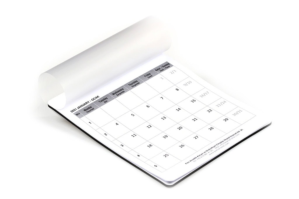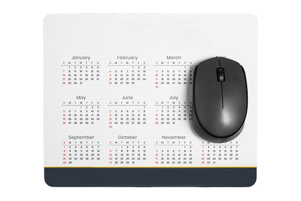 Son revêtement supérieur en PVC transparent assure un glissement fluide de la souris et une excellente visibilité du logo. Les pages du calendrier, imprimées en haute qualité, permettent une planification claire et pratique tout au long de l’année. Chaque jour, votre marque reste visible, renforçant ainsi sa notoriété de manière subtile et durable.